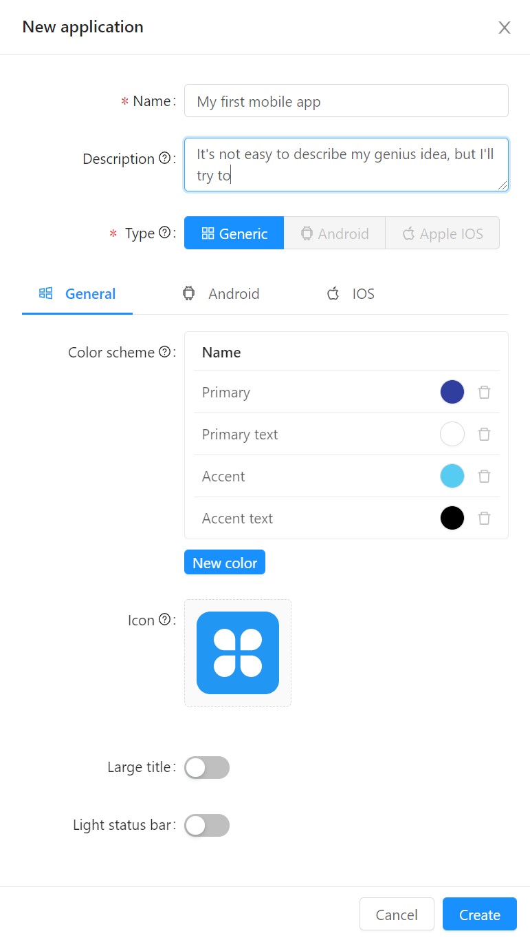 In the app creation form, you can choose a custom color scheme for your app, icon and some settings. In the current release, you can create only a general type of application: UI build by you will be automatically adjusted for every platform. In future releases, you will be able to create separate apps for every mobile platform.