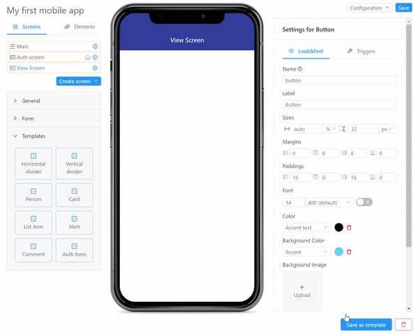 To place a widget on the current screen drag it from the left panel and drop it to the desired location on the screen. Click on the element to select it. After an element is selected its settings rendered in the right panel. All changes to element preview applied immediately, while you still need to save Mobile Application Scheme to be included in the next publication.
