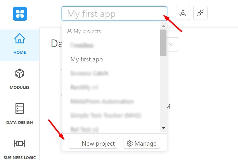 If you just created an AppMaster.io account you will be automatically redirected to the new project wizard. There is a button to create a new project on the My projects page.